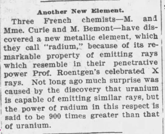 News report describing "radium" and its high radioactivity. (Kenosha News 1899)
